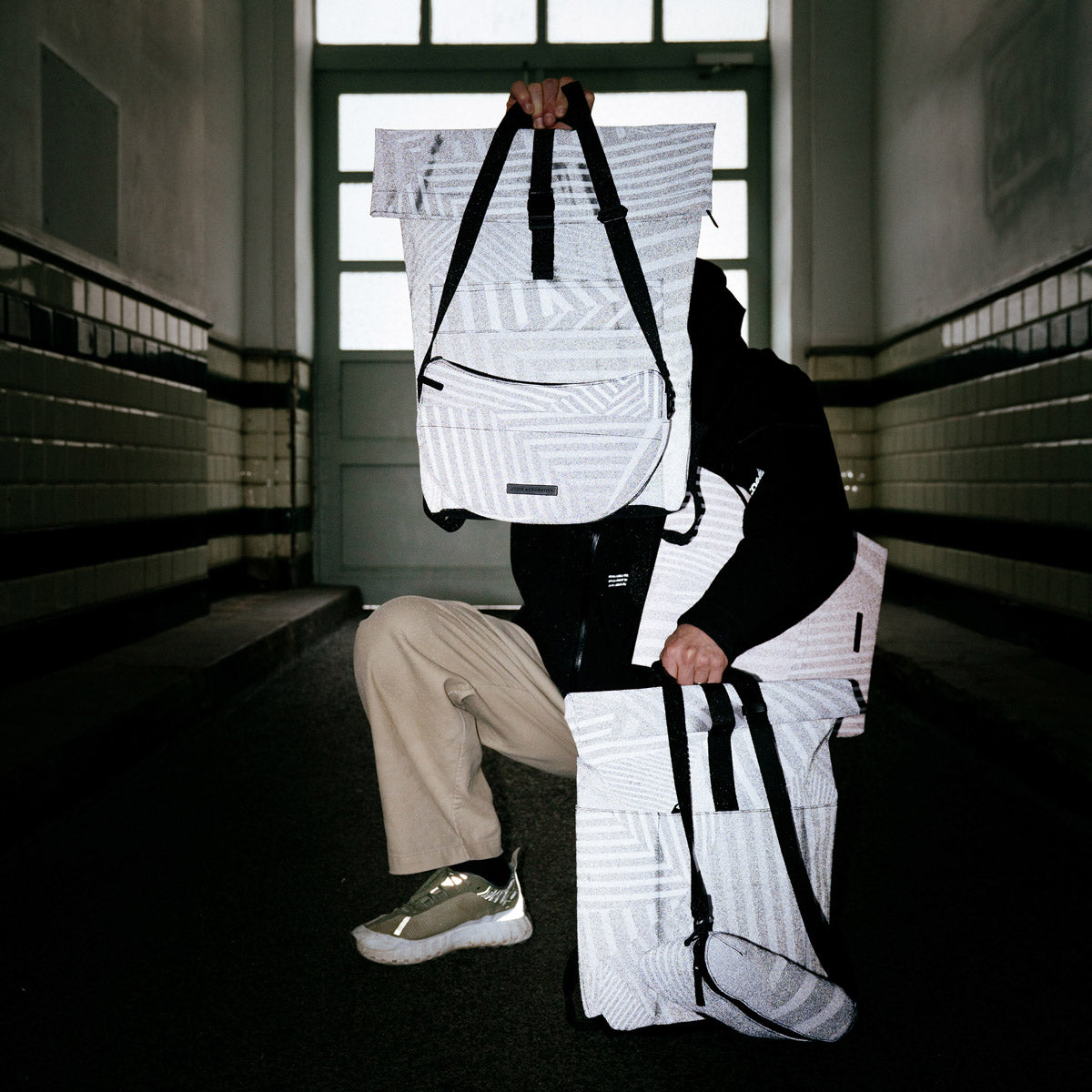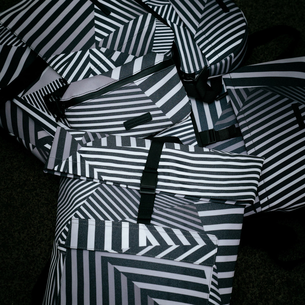 Notre matière principale spécialement développée réfléchit dans l'obscurité et établit de nouvelles normes. Elle a été fabriquée à partir de textiles recyclés, puis imprimée à l'aide d'un procédé de sublimation haute résolution. Pour cette édition, Ucon Acrobatics s'est associé à Fons Hickmann, réputé pour son travail innovant et avant-gardiste dans le monde du design. Sa création explore les illusions d'optique et l'abstraction géométrique, utilisant des rayures noires et blanches audacieuses qui s'entrecroisent et se chevauchent pour créer un effet tridimensionnel saisissant. Avec des influences évidentes de l'« op art », le design joue avec des lignes et des formes très contrastées qui semblent se déplacer et vibrer sous vos yeux.